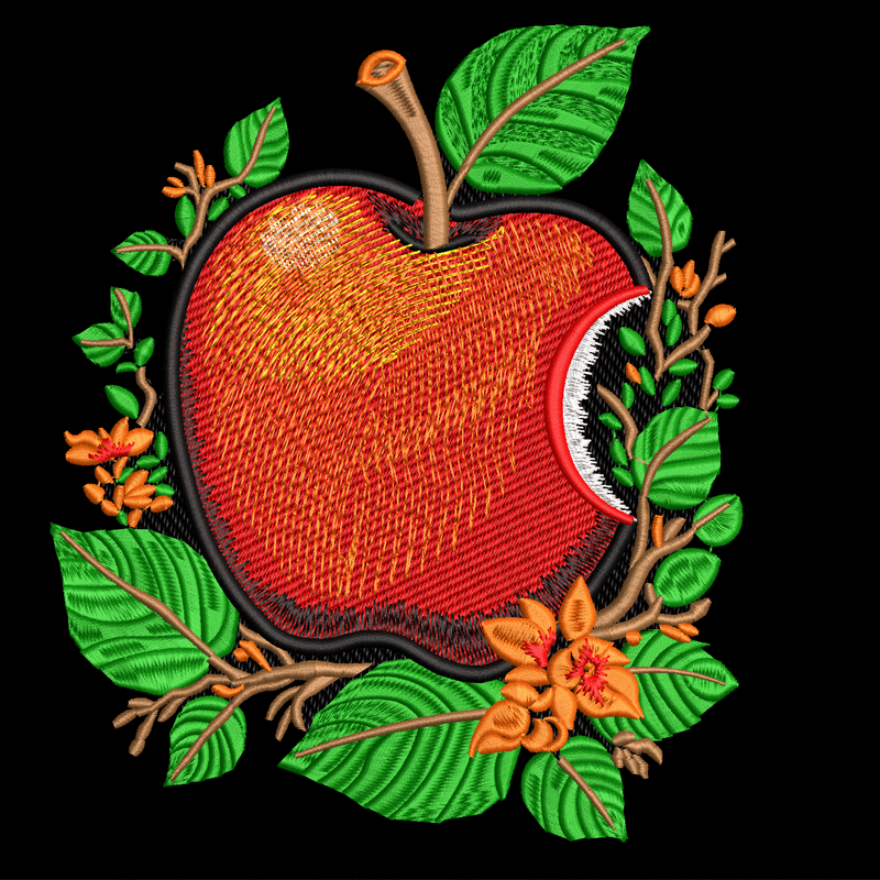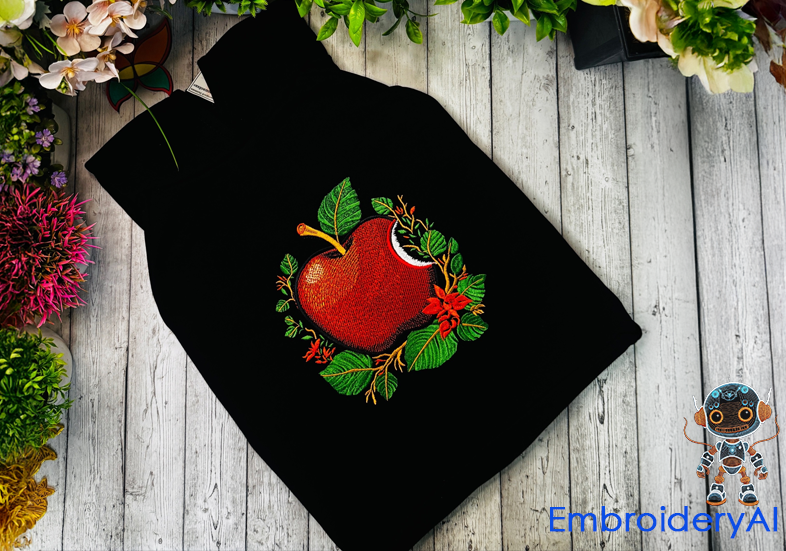 Ваша любовь к Apple выходит за рамки электроники? Ловите свежий, сочный дизайнерский паттерн для машинной вышивки – яркое яблоко среди зелёной листвы и оранжевых цветов! 😍