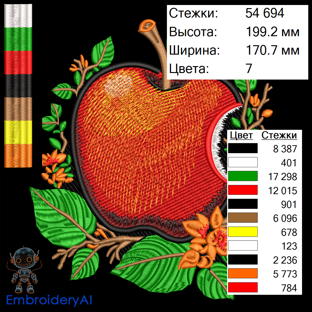 Этот насыщенный и деталированный дизайн отлично ложится на плотный трикотаж (например, футер трёхнитка), джинсу и другие плотные ткани. Хотите подчеркнуть индивидуальность любимого свитшота или джинсовки? Добавьте капельку "яблочного" вдохновения и обретите свой эксклюзив! ✨