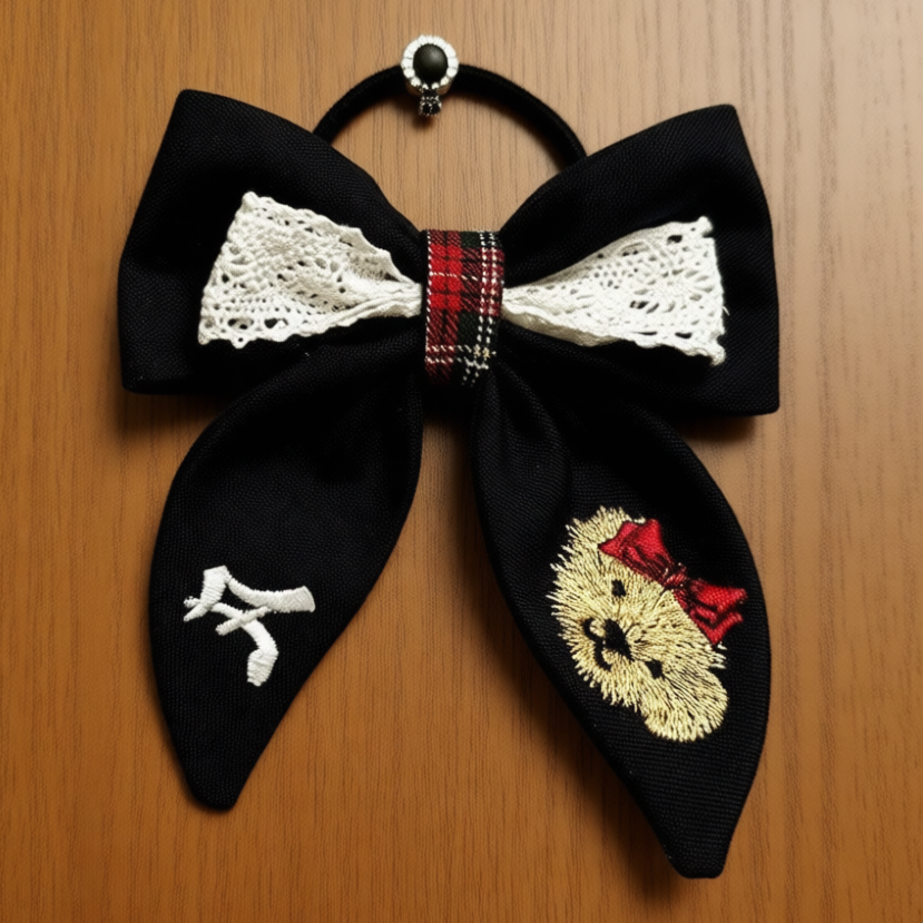 - 🪡Накладываем ткань и вышиваем чёрным цветом №8, одновременно оформляя центр банта цветом №1.