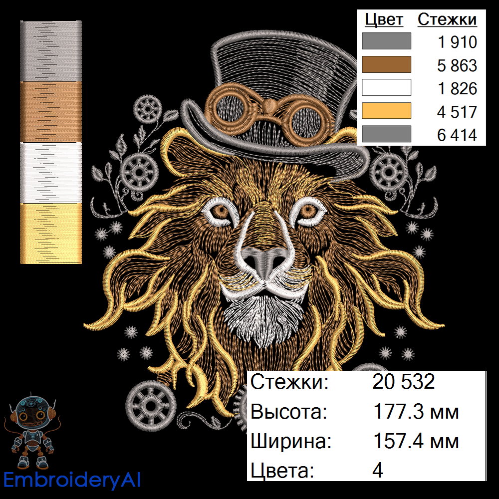 Машинная вышивка «ЛЕВ СТИМПАНК» — это не просто декоративный элемент, а настоящий механизированный правитель ткани! 🏗️👑 В этом уникальном строчном дизайне каждая линия — словно гирька в сложном часовом механизме, а плавные завитки манежной гривы выглядят так, будто собраны из бронзовых проводов и латунных шестеренок.